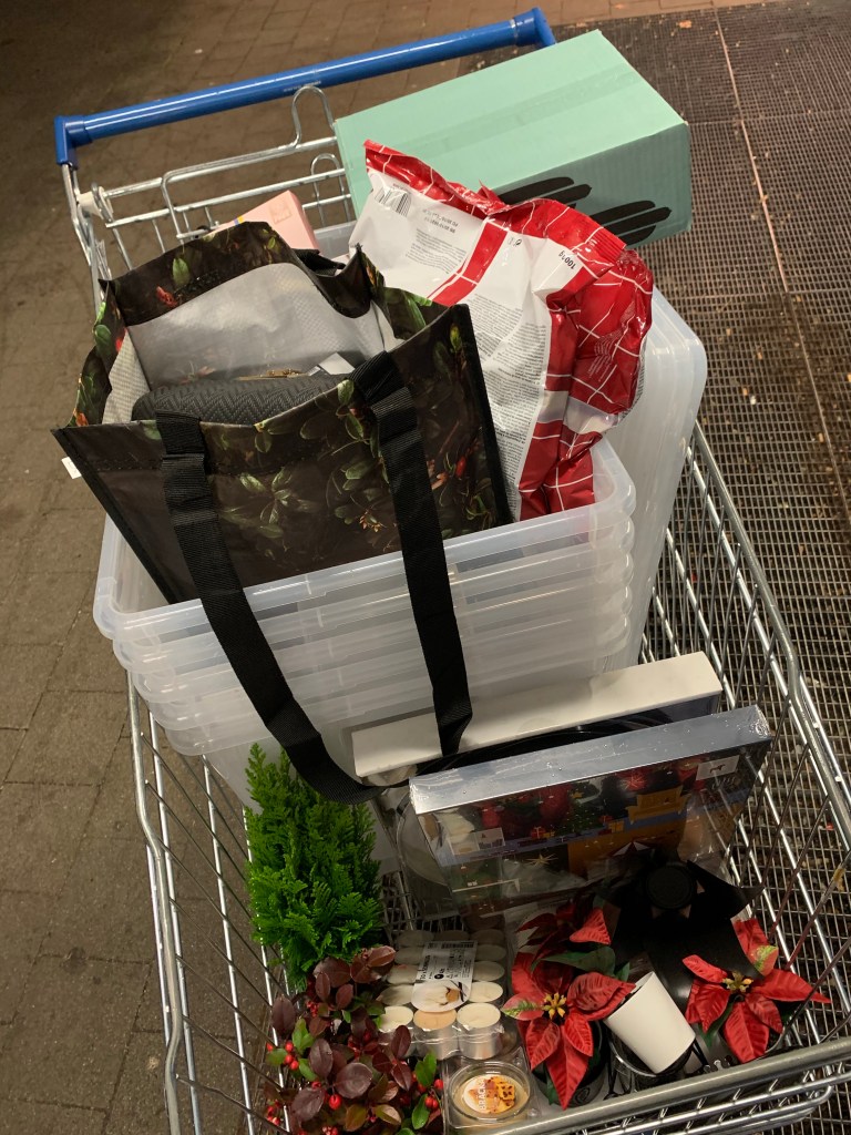 Endlich an den Boxen angekommen, gab es natürlich die gewünschte Größe nicht. Toll, da hätte man sie doch gleich online bestellen können. Aber das wir nicht umsonst gefahren sind, haben wir die kleinere Größe gleich mitgenommen. Dann wanderten noch Kerzen, Kerzenständer, schwarze Tablets und Pflanzen in den Wagen. Am Weihnachtszeug vorbei. Eher schneller als sonst, damit nichts unnötiges noch mitkommt. Fundgrube wurde natürlich auch nicht ausgelassen, aber war gut das da nix dabei war. Wir wollten ja nur Boxen. An die Kasse knapp jeder 100,/ Euro da gelassen und raus hier. 😊