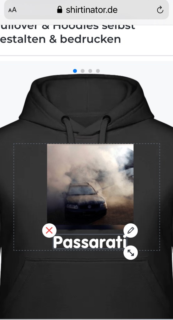 neulich hatte mein lieber Nachbar und guter Freund Geburtstag. Ich war, wie es wahrscheinlich bei vielen so ist, einfach ideenlos was ich ihm zum 22. schenken könnte. Ich googelte nach irgendeiner Idee, aber nichts passte. Als ich von ihm eine Whatsapp Nachricht bekam ist mir sein Profilbild, das er allerdings schon seeehr lange hatte wieder ins Auge gestochen. Es ist sein alter Passat den er leider verschrotten musste. Da ich weiß das er sehr daran hang, kam mir die Idee ein T-Shirt oder einen Hoodie damit zu bedrucken. Also machte ich einen Screenshot von dem Foto mit dem Handy, mit der Hoffnung das ein Bildschirmfoto funktioniert. Zum Glück konnte man es so hochladen. Es wäre bestimmt verdächtig rüber gekommen wenn ich ihn nach einem Foto gefragt hätte.
